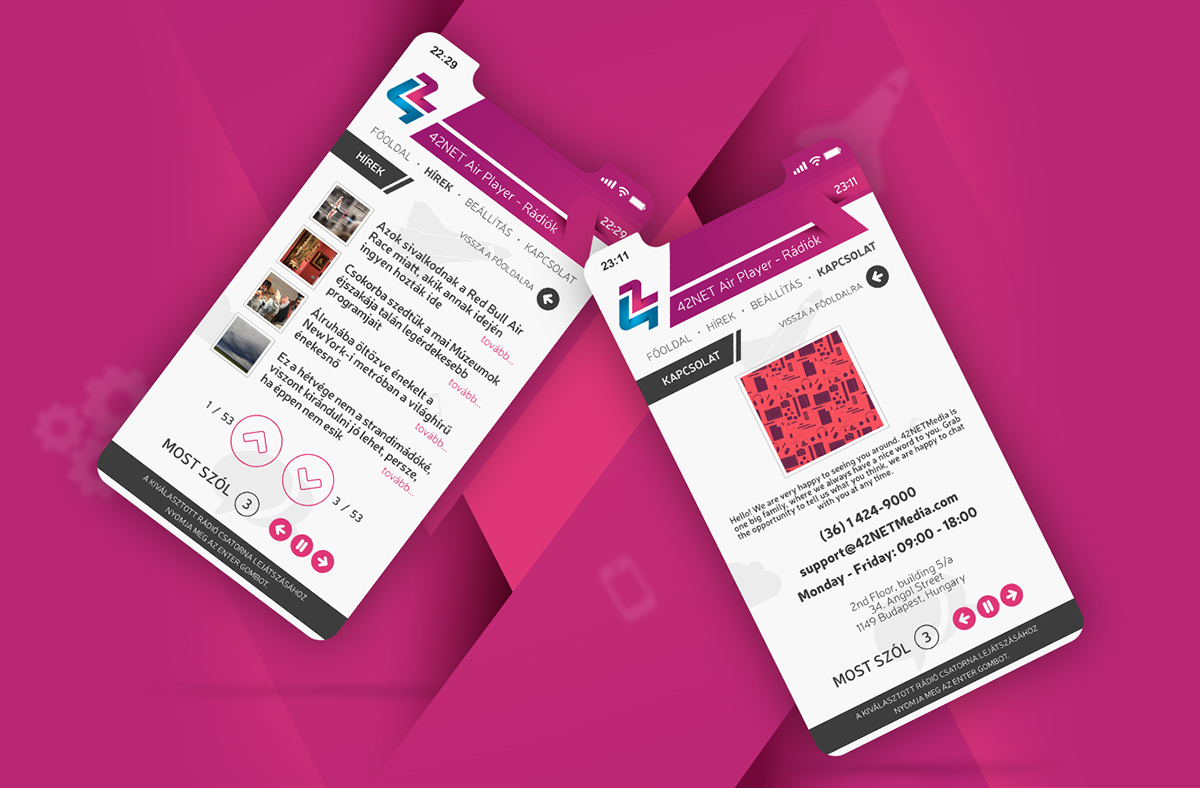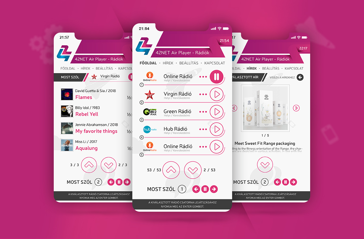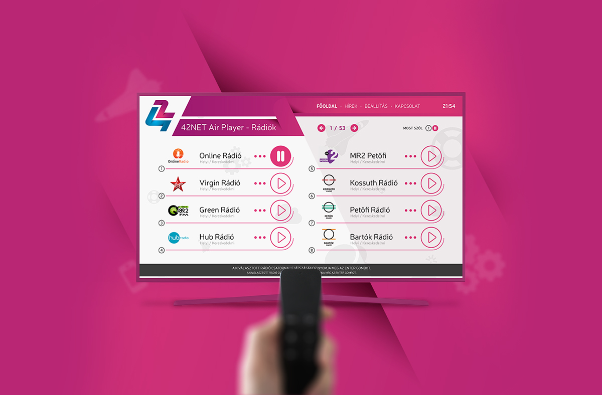 42NET Air Player is an online radio application for televisions and mobile phones and tablets. Its owner is the 42NET Media Kft. Almost all the radio channels can be listened by using this application. Creative elements was applied by me during the design stage while all visuality remained very plain and clear. The intention was to keep the surface of the application user-friendly and nice.