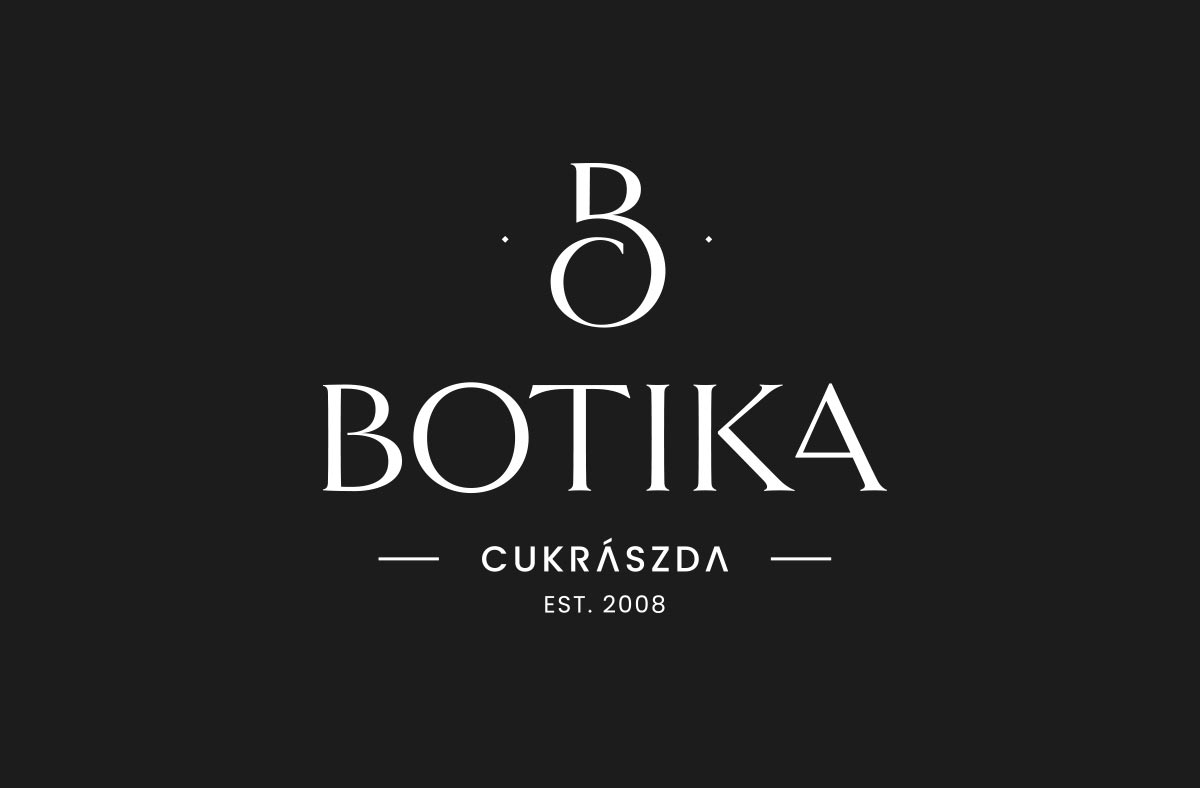 The initials of “Botika Cukrászda” were merged together in the logo. The main concept was to create an appealing logo using two letters, combined with the spiral visual representation of the well-known cream mixing process in pastry making. This design aimed to achieve a clean and unique appearance. A distinctive typeface was chosen to enhance its eye-catching nature, all in a monochromatic color scheme.